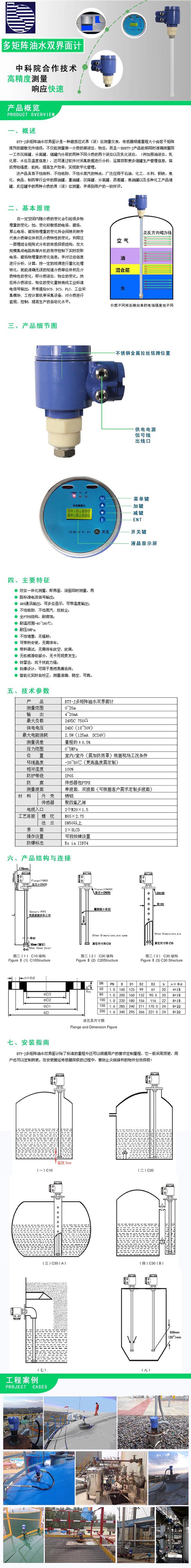 BTY-J多矩陣油水雙界面計(jì)是一種磁感應(yīng)式界(液)位測(cè)量?jī)x表,傳感器根據(jù)量程大小由若干矩陣排列的磁敏元件組成,不僅能測(cè)量單一介質(zhì)的單液位、物位,而且一臺(tái)BTY-J產(chǎn)品能夠同時(shí)準(zhǔn)確測(cè)量同一工作沉降罐、分離罐、儲(chǔ)罐內(nèi)分層的兩種不同介質(zhì)的兩個(gè)液位以及乳化液位,(例如原油液位、乳化層、水位及溫度信息),還可通過(guò)軟件對(duì)采集數(shù)據(jù)進(jìn)行分析、運(yùn)算獲取更多儲(chǔ)罐生產(chǎn)管理信息,降低勞動(dòng)強(qiáng)度、能耗,提高生產(chǎn)效率,實(shí)現(xiàn)數(shù)字化管理。 該產(chǎn)品具有不怕掛料、不怕粘附、不怕水蒸汽的特點(diǎn),廣泛應(yīng)用于石油、化工、水利、鋼鐵、焦化、食品、制藥等行業(yè)中的原油罐、重油罐、沉降罐、分離罐、瀝青罐、焦油罐以及各種化工產(chǎn)品儲(chǔ)罐、反應(yīng)罐中的兩種介質(zhì)的界(液)位測(cè)量,并得到用戶(hù)的一致好評(píng)。
