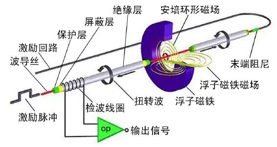 磁致伸縮液位計主要由電子部件、磁致伸縮波導絲、浮子等部分組成。測量時,電子部件產(chǎn)生一個電流“激勵”脈沖,該脈沖電流以光速沿波導絲向下運行,并在波導絲周圍形成周向安培環(huán)形磁場。當激勵脈沖電流產(chǎn)生的環(huán)形磁場與浮子內(nèi)永磁鐵產(chǎn)生的偏置磁場相遇時,浮子周圍的磁場發(fā)生改變,從而使得由磁致伸縮材料做成的波導絲在浮子所在的位置產(chǎn)生一個感應扭轉(zhuǎn)波脈沖,該扭轉(zhuǎn)波以聲速由產(chǎn)生點向波導絲的兩端傳播,傳向末端的扭轉(zhuǎn)波被阻尼器件吸收,傳向激勵端的信號則被檢波裝置接收,并由電子部件測量出脈沖電流與扭轉(zhuǎn)波的時間差,再乘以扭轉(zhuǎn)波在波導絲中的傳播速度(固定量為2800m/s),即可計算出浮子產(chǎn)生扭轉(zhuǎn)波的位置與測量基準點間的距離,也就是液面的位置。磁致伸縮液位計傳感器原理見下圖。
